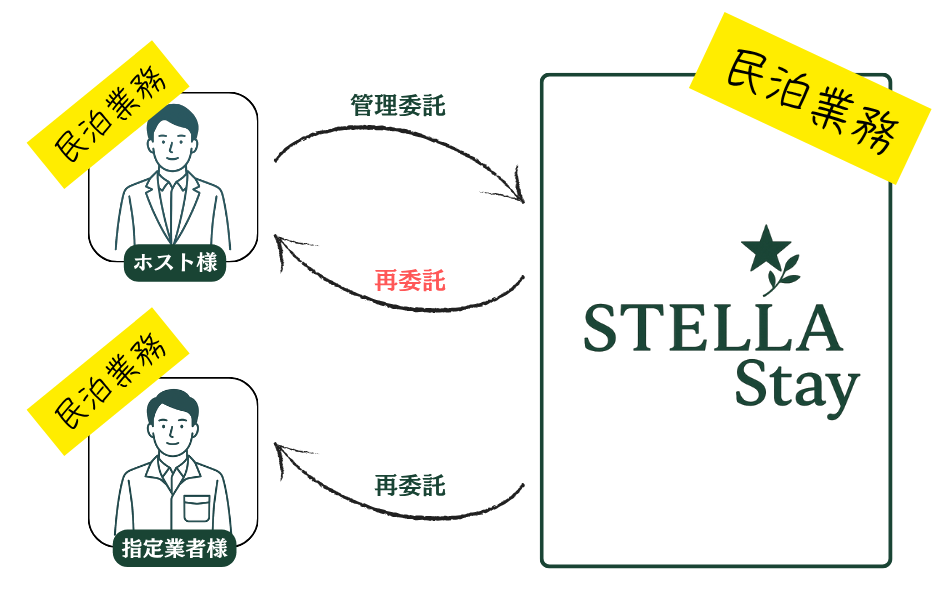 しかし、STELLA Stayの再委託型運営では、住宅宿泊管理業者が一部業務をホストまたはホストが選んだ事業者に「再委託」できる仕組みを採用しています。